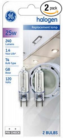 • Ge, 2 pack, q25g8/Scd2, 25W, quartz halogen lamp, G8 base, T4 Bulb shape, 2 pin G8 base, 120V, cc-2v filament design, 1
