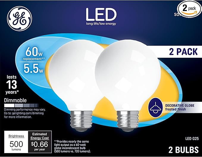 GE LED Light Bulbs, 60 Watt, Soft White, G25 Globe Bulbs, Frosted, Medium Base (2 Pack)