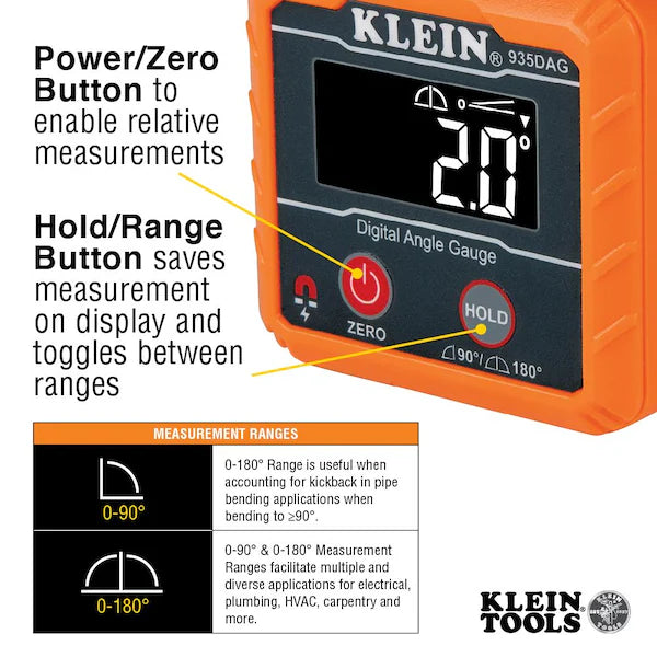 Klein Tools Digital Angle Gauge and Level delivers precision measurement in one compact tool. Features a bright digital display for accurate angle readings up to 360 degrees and built-in level functions for horizontal and vertical alignment. Perfect for construction, carpentry, and DIY projects. Durable design with easy-to-read LCD screen makes quick work of layout and installation tasks.